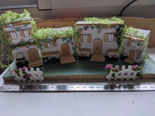 Maisons vêtues de lierre avec un portail blanc et des fleurs roses